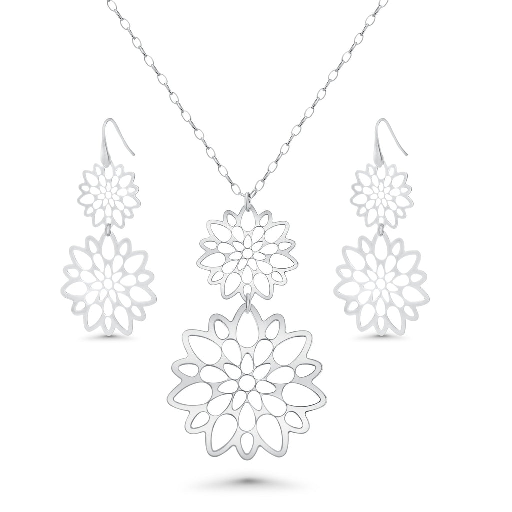 Elevate your jewelry collection with this sophisticated sterling silver set, featuring meticulously crafted double cut-out flower designs. Each piece is rhodium plated to enhance durability and maintain a brilliant, tarnish-resistant finish. The coordinated earring and necklace combination showcases intricate floral detailing that catches light beautifully from every angle. Crafted from genuine 925 sterling silver, this set delivers both elegance and lasting quality. Perfect for special occasions or everyday refinement, these pieces complement any wardrobe with timeless botanical charm and professional craftsmanship.