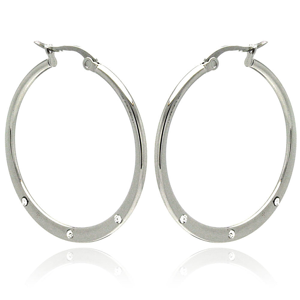 Rhodium Plated Stainless Steel 3 Cubic Zirconia Flat Hoop Earrings