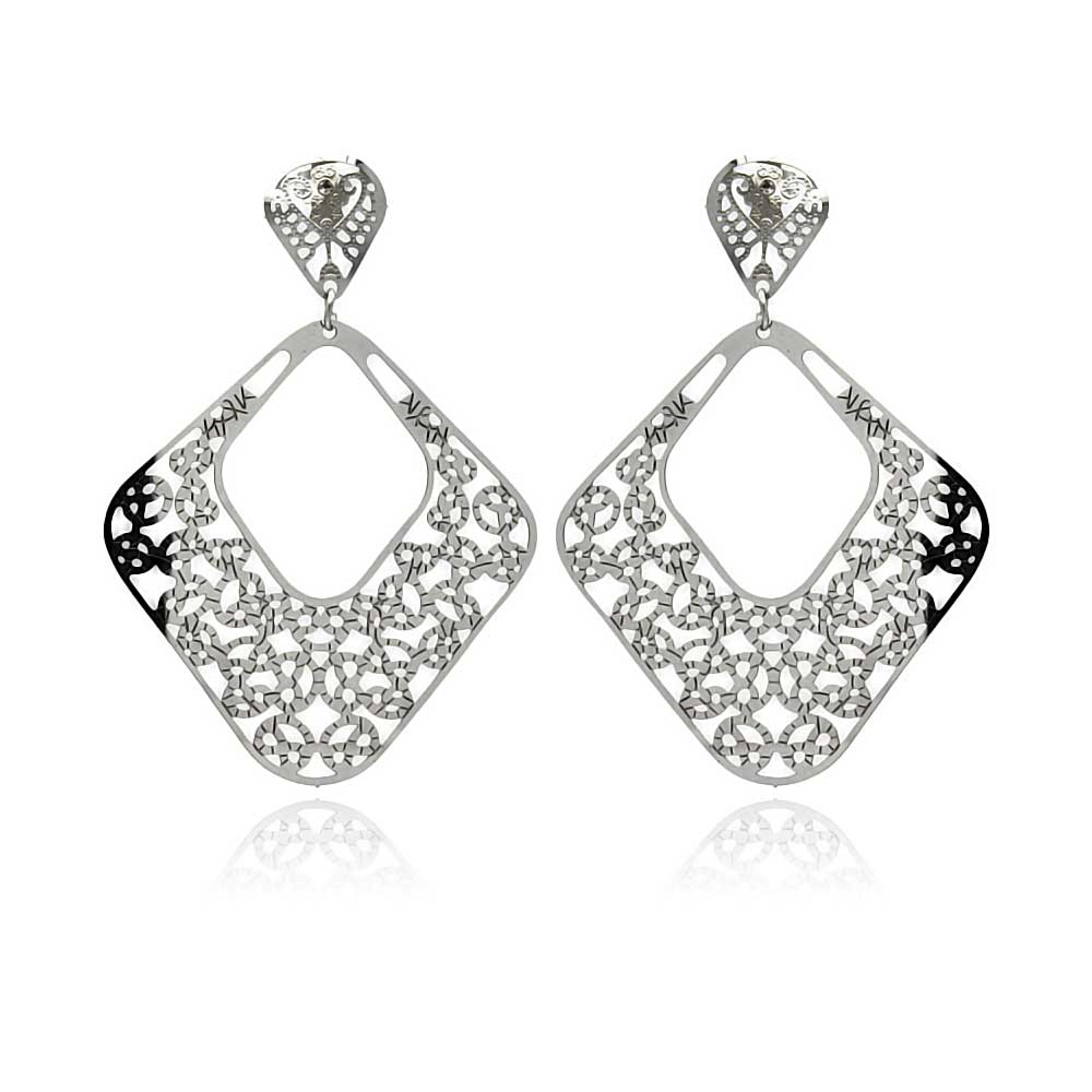 Rhodium Plated Stainless Steel Filigree Diamond Shaped Dangle Earrings