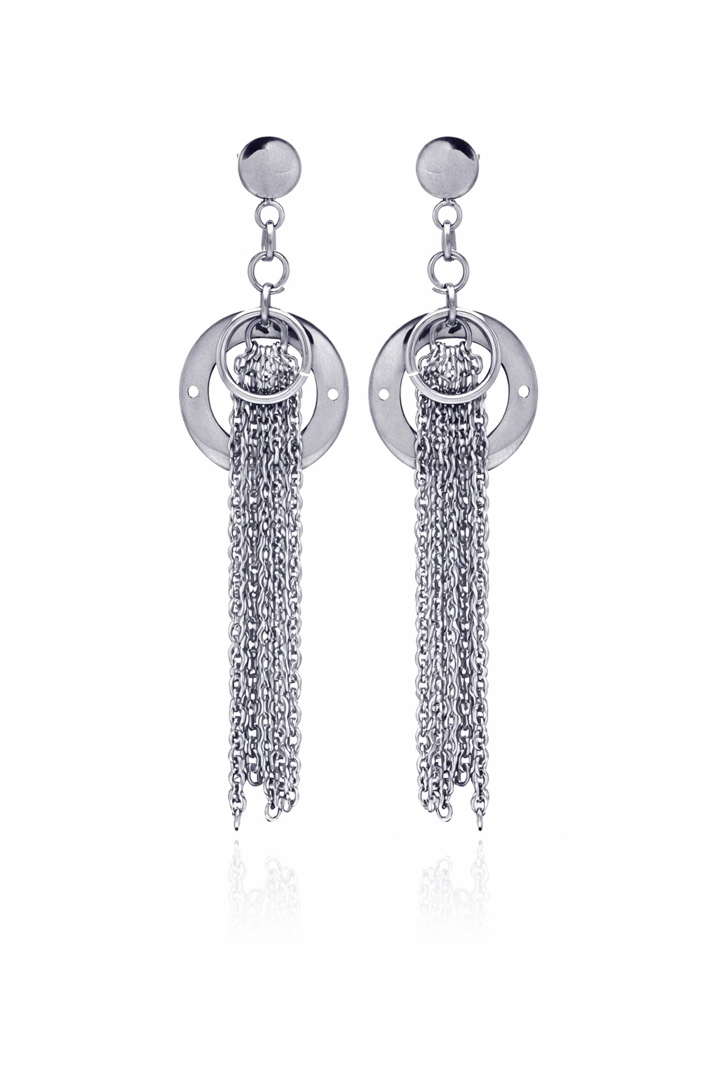 Rhodium Plated Stainless Steel Open Disc Chain Link Chandelier Earrings