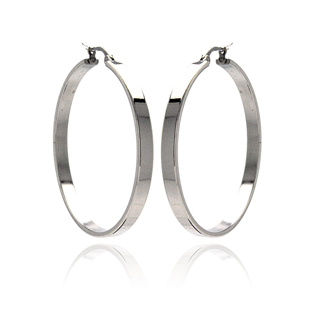 Rhodium Plated Stainless Steel Plain Flat Hoop Earrings