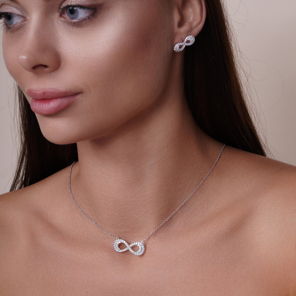 Este es un juego de aretes y collar con doble línea de infinito de plata de ley. La longitud de la cadena es de 16 a 18 pulgadas, ajustable. Las dimensiones de pendientes y colgante son las siguientes: