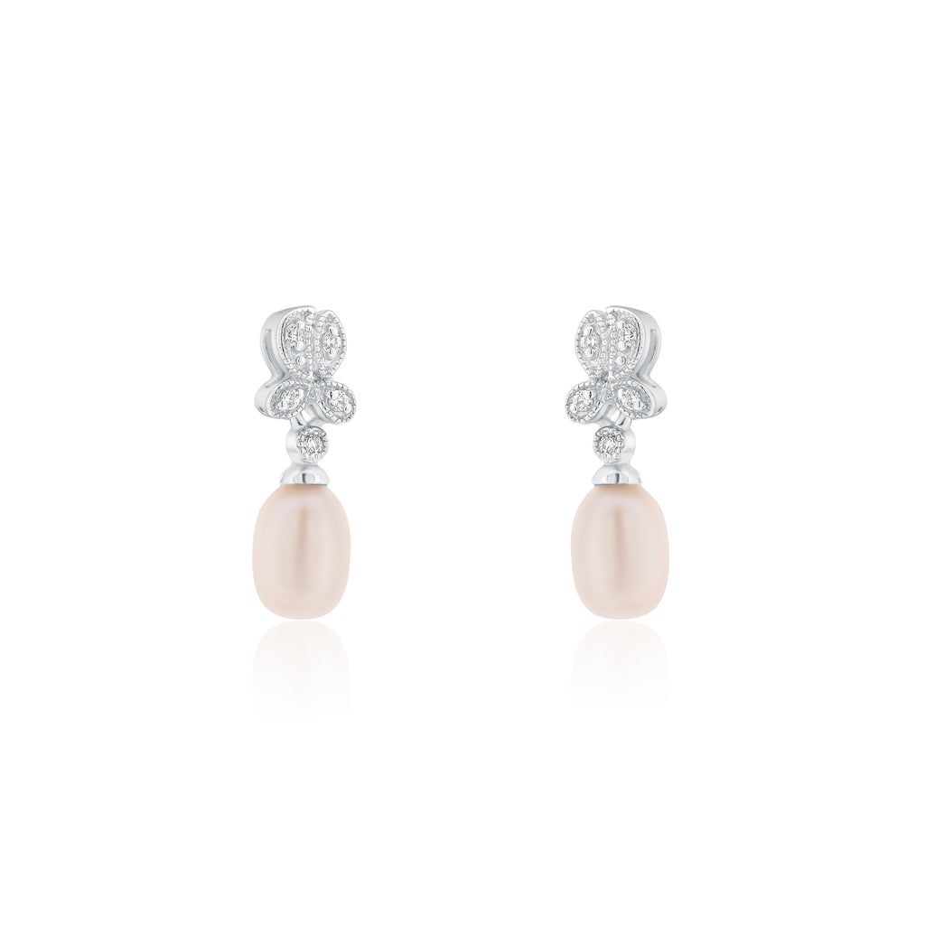 Venta al por mayor de plata esterlina 925, juego colgante de circonia cúbica transparente con flor de perla de agua dulce chapada en rodio