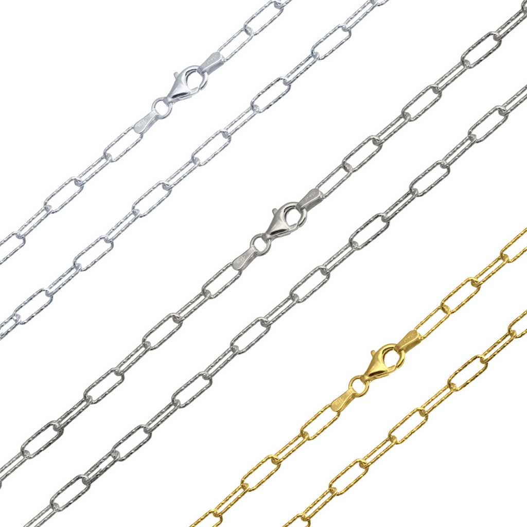 925 Sterling Silver Diamond Cut Paperclip Chain features a distinctive faceted design that catches light beautifully. Crafted from genuine sterling silver, this durable chain offers timeless elegance for layering or wearing solo. The paperclip link style provides a modern, geometric aesthetic that complements both casual and refined looks. Perfect for showcasing pendants or wearing as a standalone statement piece. Ideal for everyday wear or special occasions.