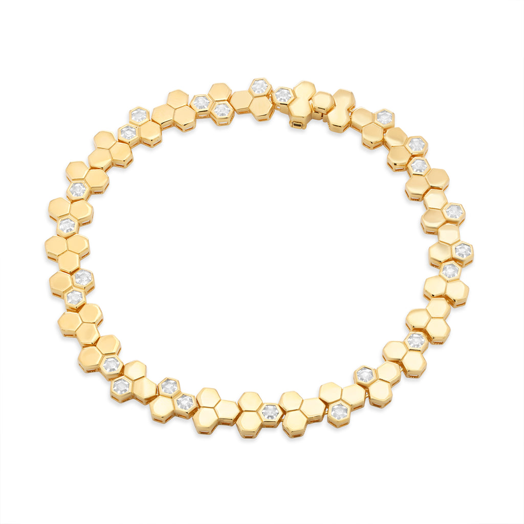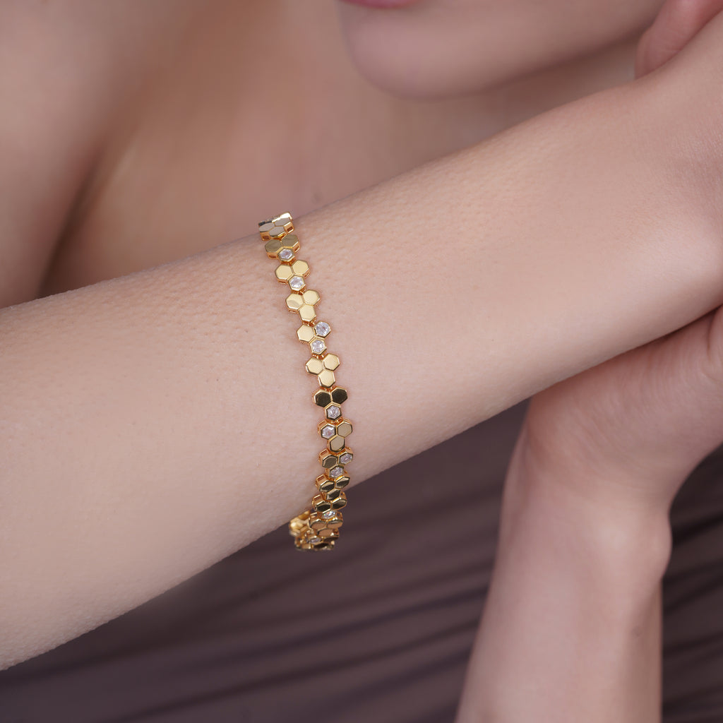 This exquisite bracelet combines timeless elegance with contemporary design. Crafted from 925 sterling silver and finished with luxurious gold plating, each link features a distinctive honeycomb hexagonal pattern that catches light beautifully. The 7mm width strikes an ideal balance between presence and wearability, making it suitable for both everyday wear and special occasions. The secure link construction ensures durability and longevity, while the precious metal composition guarantees lasting quality. A sophisticated accessory that elevates any ensemble with refined style and understated luxury.