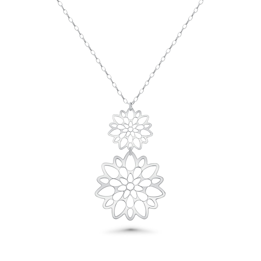 Elevate your jewelry collection with this sophisticated sterling silver set, featuring meticulously crafted double cut-out flower designs. Each piece is rhodium plated to enhance durability and maintain a brilliant, tarnish-resistant finish. The coordinated earring and necklace combination showcases intricate floral detailing that catches light beautifully from every angle. Crafted from genuine 925 sterling silver, this set delivers both elegance and lasting quality. Perfect for special occasions or everyday refinement, these pieces complement any wardrobe with timeless botanical charm and professional craftsmanship.
