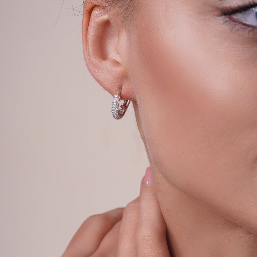 These Rhodium Plated 925 Sterling Silver Micro Pave CZ Huggie Hoop Earrings combine durability with refined sparkle. Crafted from high-quality sterling silver and enhanced with a rhodium plating, they resist tarnish and maintain their shine. The micro pave Cubic Zirconia stones add a delicate brilliance, creating a sophisticated yet subtle statement perfect for everyday wear or special occasions. Their secure huggie design ensures comfort and reliability for extended use.