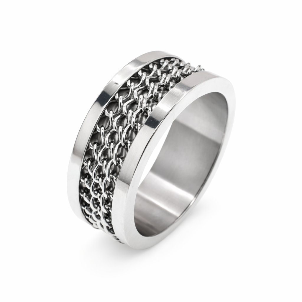 Rhodium Plated Stainless Steel Chain Link Inlay Men's Ring- SRB0018