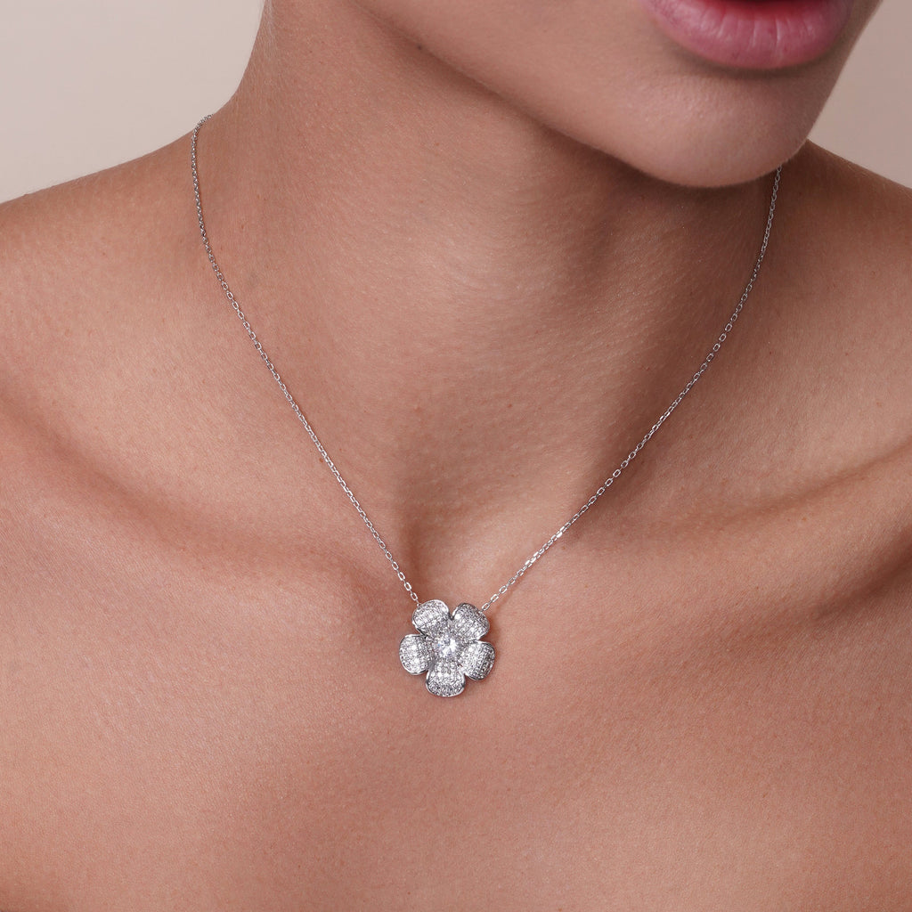 Wholesale Sterling Silver 925 Rhodium Plated Clear Pave Set Flower CZ Stud Earring and Necklace Set