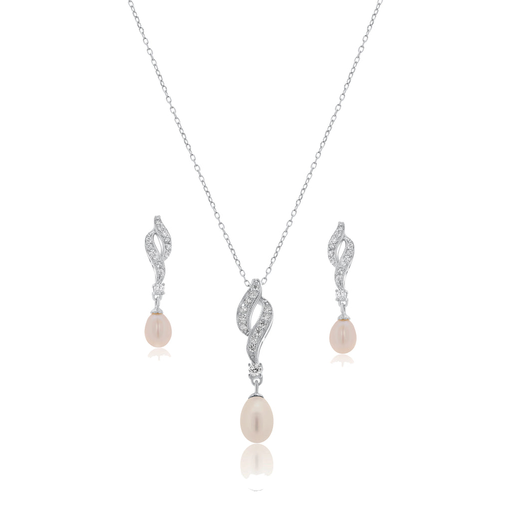 Wholesale Sterling Silver 925 Rhodium Plated Fresh Water Pearl Twist Clear CZ Hanging Set