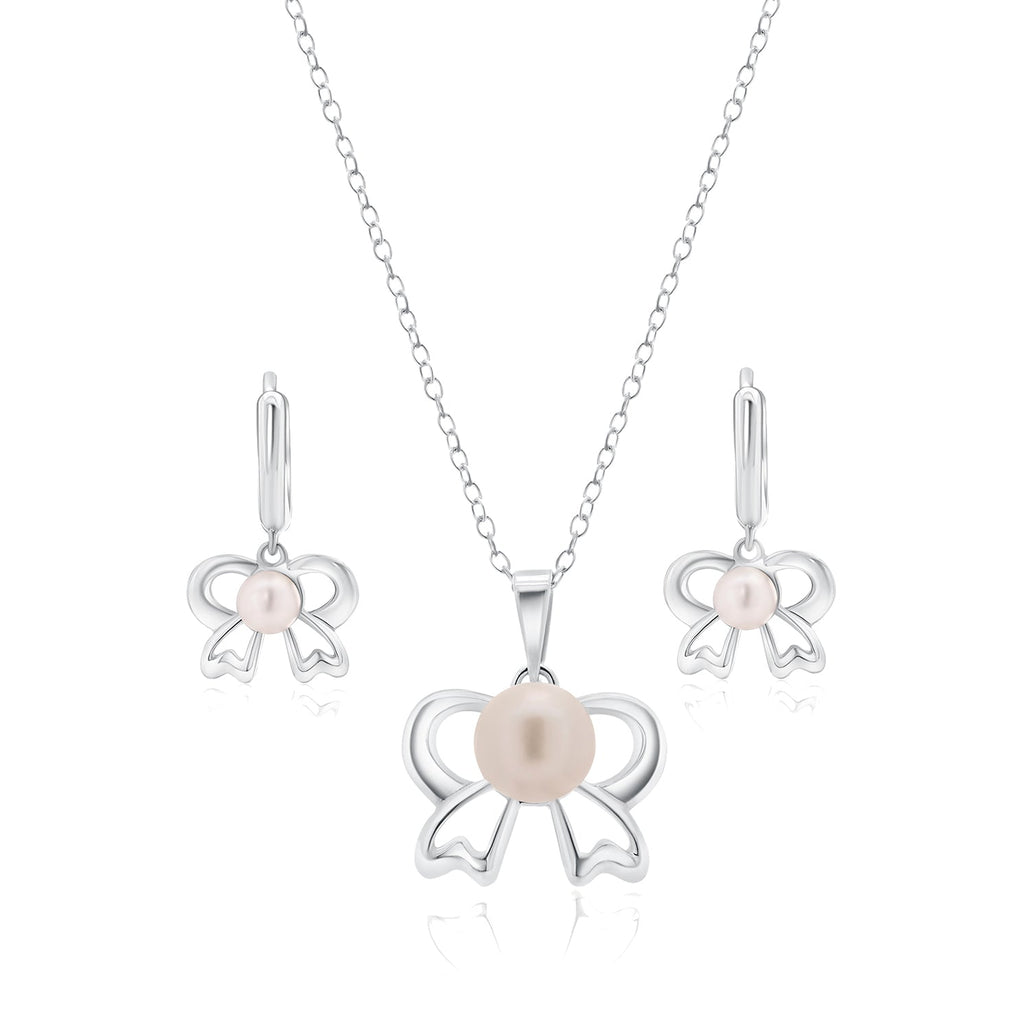Wholesale Sterling Silver 925 Rhodium Plated Pearl Bow Lever back Earring and Necklace Set